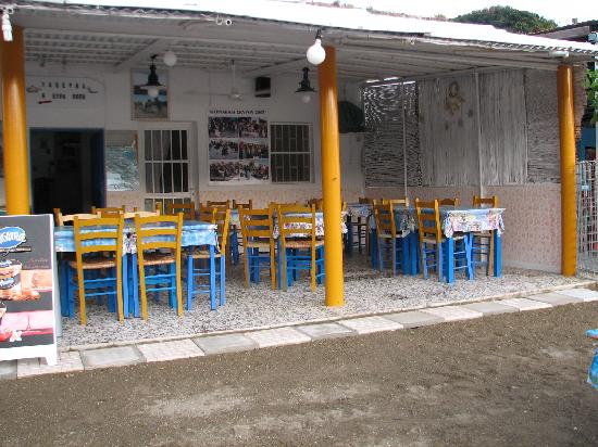A pebbly and sandy beach surrounded by beautiful pine trees, situated at the north of the island. It isn’t organized, but there is a nice tavern nearby.