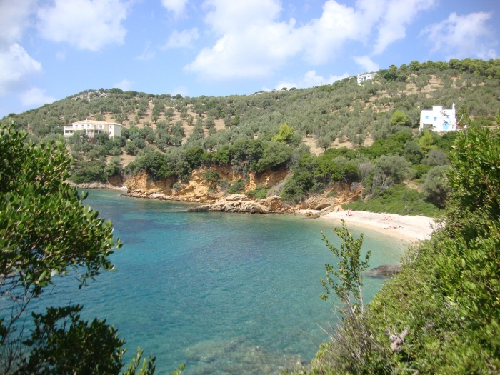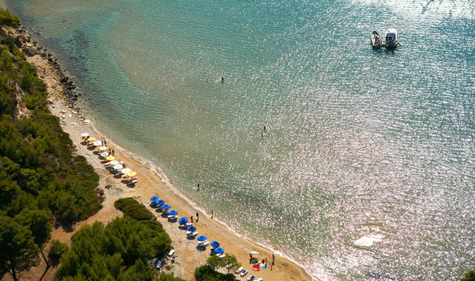 Don’t be fooled, because this beach is neither large nor sandy – on the contrary. However, it’s one of the island’s most pristine, with pebbles, lots of pine trees and zero facilities.