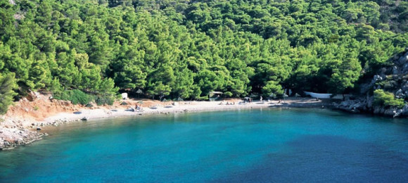 Small bay with pebbles, where pines provide nice shade. Water sports available.
