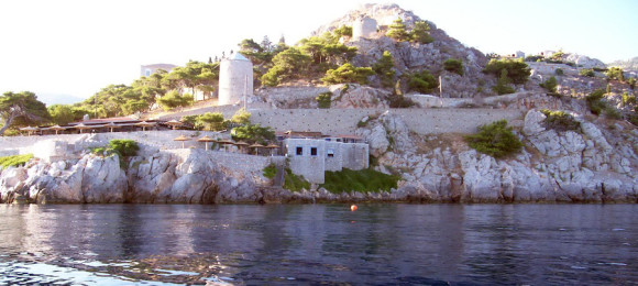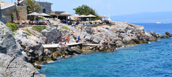 One of the most popular in the island, set under the castle canyons. It’s not actually a beach, but people dive in its deep blue waters from a small cement deck, to the sounds of music played by the bar just above.