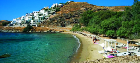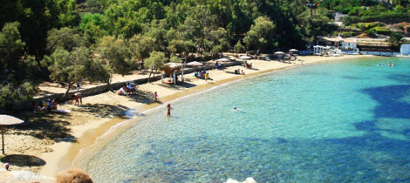 Small seashore with blue waters, tamarisk trees and a beach bar, ideal for swimming.