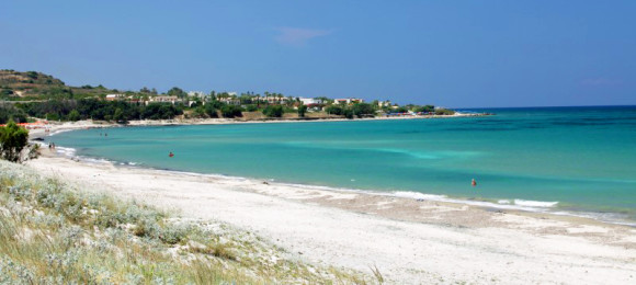 Light blue waters and white sand make this beach look exotic. It is well organized, ideal for windsurfing and located at the homonymous touristic settlement, famous for its fish taverns.
