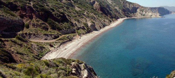 There are two beaches named Firi Ammos in Kythira. This one is located southeast, near the village of Kalamos. It is large, with red sand and pebbles, deep waters, a cantina, sun beds and umbrellas.
