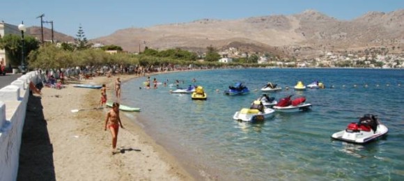 The longest and most popular beach on Leros is situated at the homonymous touristic resort, offering all kinds of amenities, water sports and taverns. It is sandy, with tamarisk trees and rather crowded.