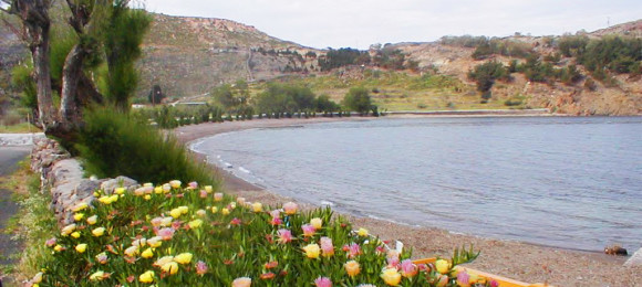 The closest beach to Skala (only 15 min on foot) is sandy, with tamarisk trees and the basic amenities mainly available at the nearby camping site of the island.