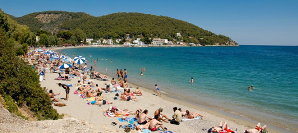 A long, sandy and pebbly beach located at the bustling touristic settlement of the same name, close to the town of Poros. It is fully organized and usually crowded.