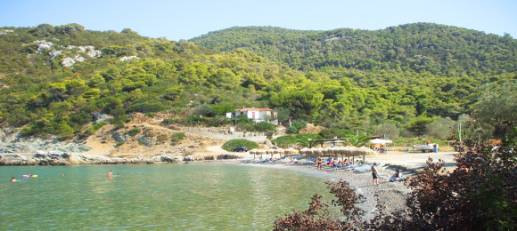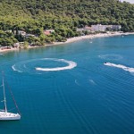 You will definitely enjoy the relaxed atmosphere of this beautiful lush pine cove with sand and pebbles – also favored by the island’s fishermen. Snorkeling fans will love it too; at the bottom of the sea lay the remains of an ancient town.