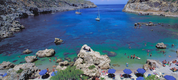A small sandy cove located next to the beach of Anthony Quinn, with emerald waters, sun beds and umbrellas. It is very scenic and ideal to relax.