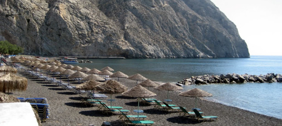 Cosmopolitan and lively, with black sand and crystal waters, it is situated in the homonymous settlement. A chain of beach bars make a (loud) difference here.