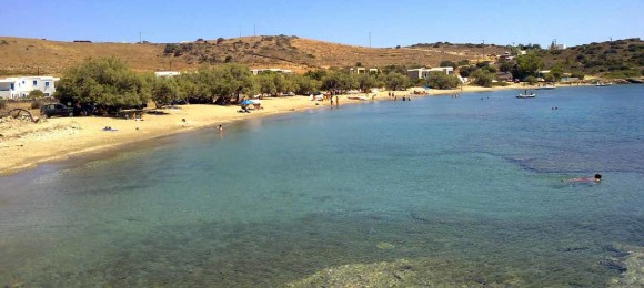 Large and sandy beach with a few trees that provide shade, plus facilities such as accommodation options and restaurants.