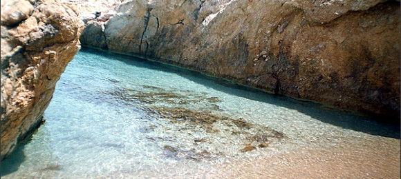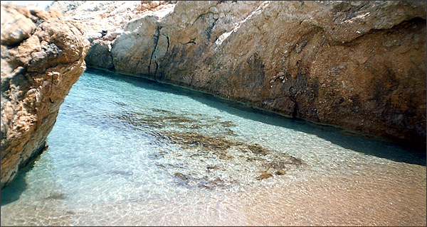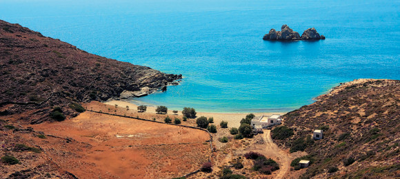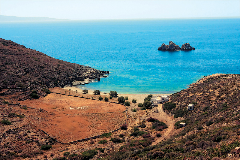 : You can access this small sandy cove with lovely waters by boat or, if you’re brave enough, by hiking (2 hours from Kastro). There’s no shade here, so make sure you carry an umbrella, as well as other supplies.