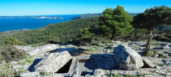 They are ancient carved tombs located at the top of Mountain Karia, the highest point of the island. The access is difficult (requires 30 minutes of hiking), but the view is totally worth it, as from there you can see islands Alonissos, Evia, Skiathos and mainland resort Pelion.