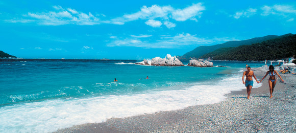 Impressive seaside with white pebbles, sand, aquamarine waters and a beach bar. Also, young people’s favorite.
