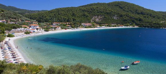 One of the island’s most beautiful, popular –and crowded- beaches, organized, sandy and pebbly.