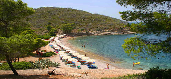 Beautiful sandy and pebbly beach, surrounded by a pine forest. It has a lively beach bar and it’s bustling with people.