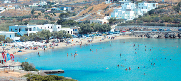 A sandy, family friendly organized beach, next to the coastal settlement of the same name. Avoid it, though, on a windy day.