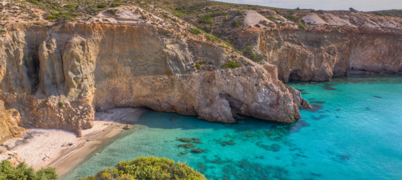 Small, sandy beach with exotic turquoise waters, surrounded by rocks. It’s totally worth descending the steep footpath to get there. Note also that you will need supplies.