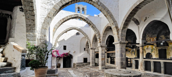 Dominating the top of the hill in Patmos’ Chora, this grey-wall imposing complex resembles a mysterious fortress that contrasts beautifully with the whitewashed houses below. It is an impressive architectural maze of chapels, cells, cisterns and other spaces, including the exceptional library and museum that host some of the most important ecclesiastical treasures of Greece.